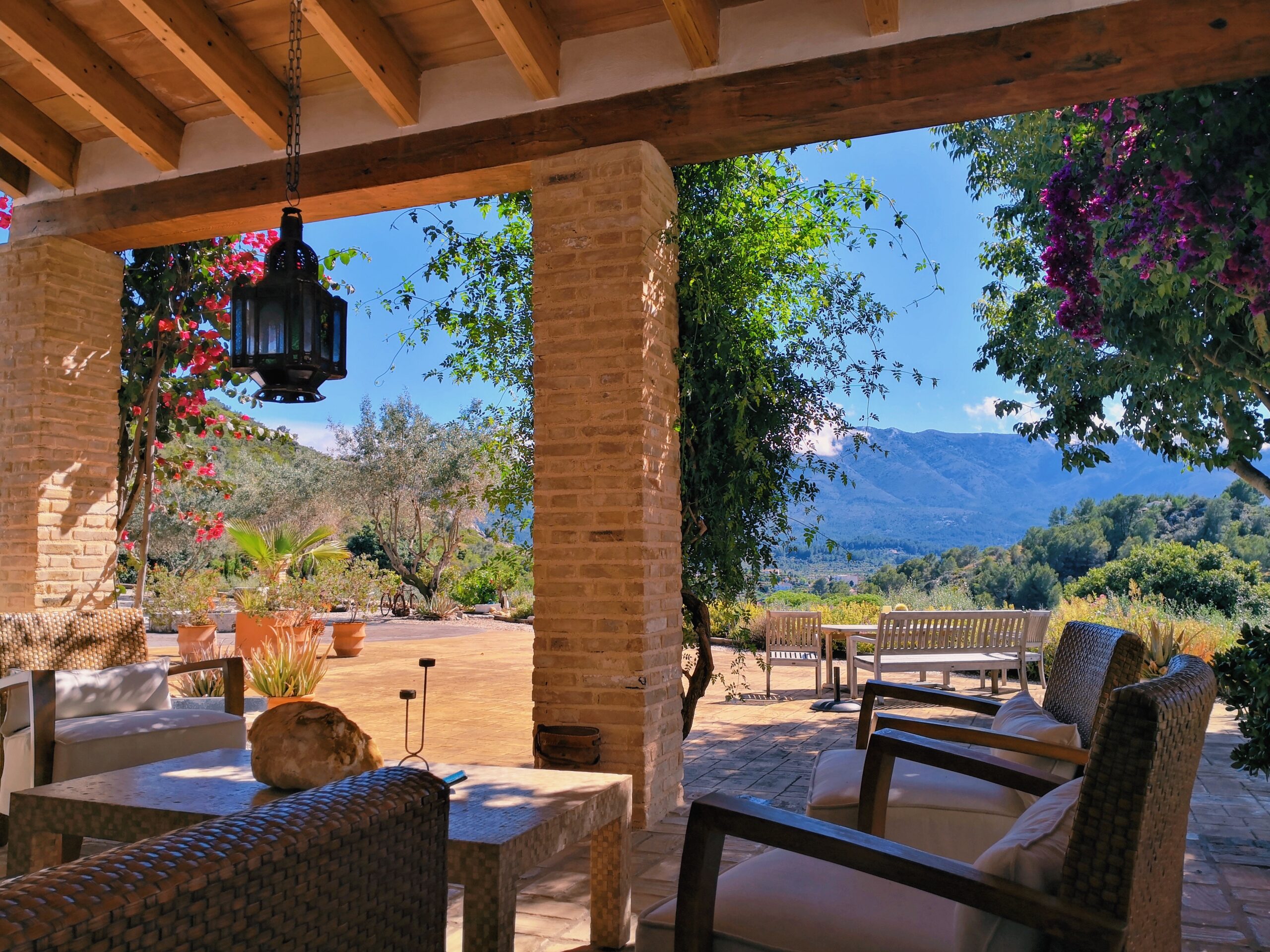 Authentiek ruim landhuis in Alcalalí met een frisse en moderne touch, olijfboomgaarden, verschillende tuinen, fascinerend zicht op de bergen en de vallei, en veel ruimte en faciliteiten voor ontspanning.